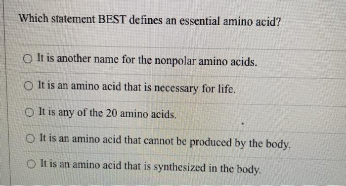 Solved Which Statement Best Defines An Essential Amino Acid Chegg Com