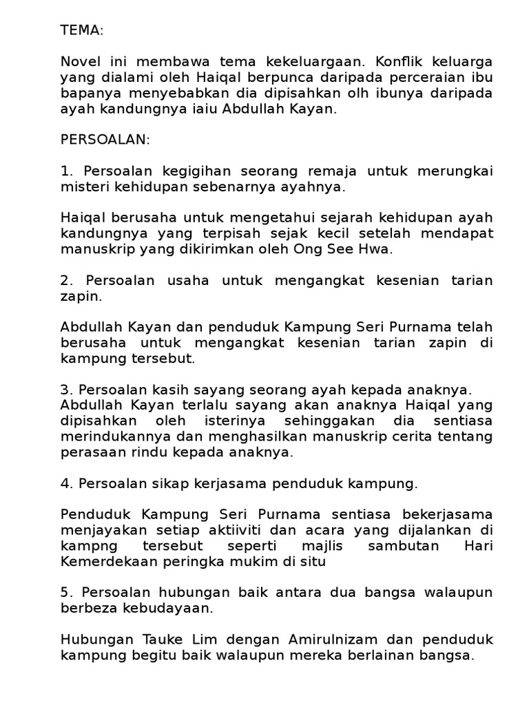 Tema novel ini ialah pengorbanan dalam memperjuangkan kebudayaan dan kesusasteraanTema ini dapat dibuktikan melalui watak Abdullah Bin Kayan dan Haiqal Haqimi. Teknik IMBaKUP dalam menghasilkan Perenggan Penuli. Kerja Lapangan Tugasan Geografi Tingkatan 3 PT3.